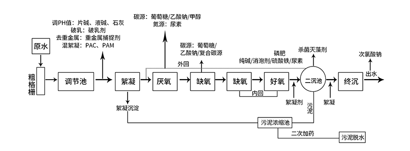 經(jīng)過(guò)了混凝沉淀去掉了大部分懸浮物→進(jìn)入生物處理,經(jīng)過(guò)了厭氧缺氧好氧這三個(gè)階段:在厭氧池中會(huì )投加碳源:葡萄糖、乙酸鈉、醋酸鈉、甲醇面粉