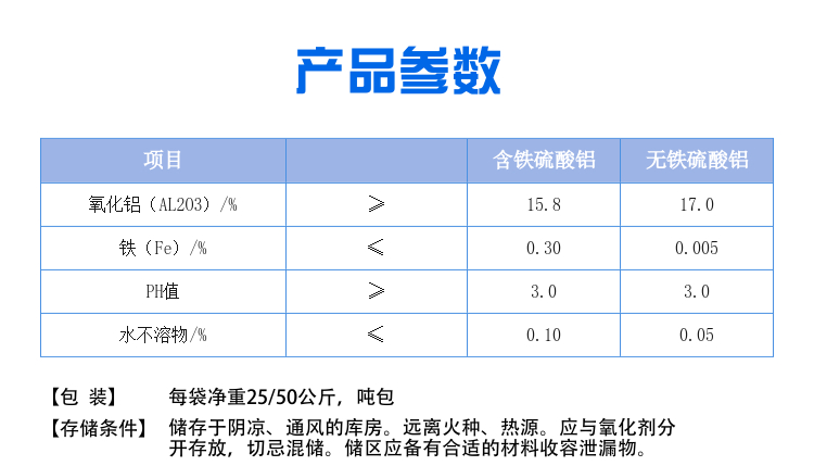 低鐵硫酸鋁液體是無(wú)味、吸濕,密度為1.69克/毫升(25℃)。無(wú)鐵硫酸鋁是一種固體產(chǎn)品,白色顆粒狀或塊狀,密度為2.71克/毫升。通俗的理解是,前者是灰白色帶一點(diǎn)綠色,后者是純白色。