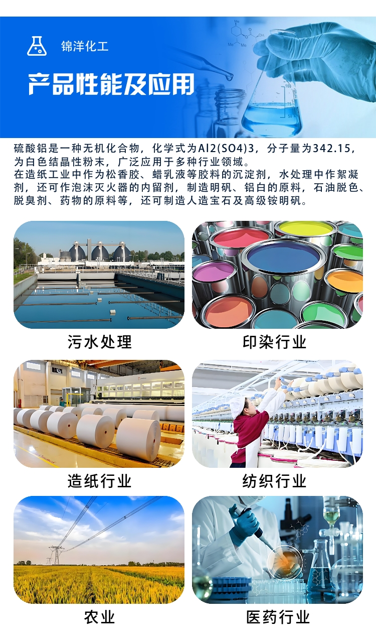 硫酸鋁在多種領(lǐng)域有廣泛的應用。它在造紙工業(yè)中用作松香膠、蠟乳液等膠料的沉淀劑,以及水處理中的絮凝劑。此外,硫酸鋁還用于制造明礬、鋁白、石油脫色脫臭劑、藥物原料、人造寶石及銨明礬等。