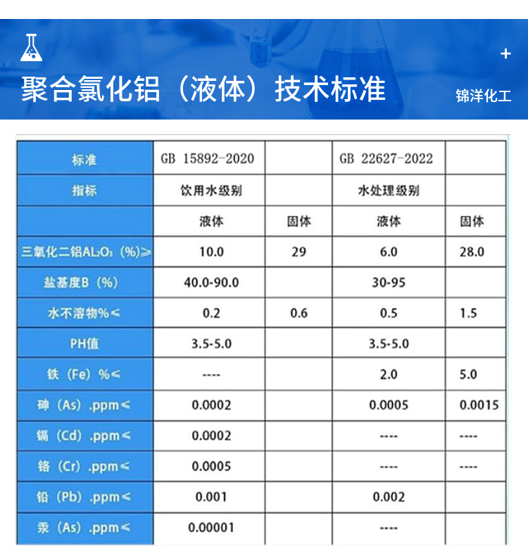 液體聚合氯化鋁是一種無(wú)機高分子絮凝劑。經(jīng)過(guò)氫氧基離子官能團和多價(jià)陰離子聚合官能團的作用,產(chǎn)生出擁有大分子量和高電荷的無(wú)機高分子??蛇m應PH值范圍為5.0-9.0,PH值為6.5-7.6。