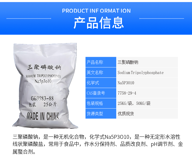 三聚磷酸鈉,是一種無(wú)機化合物,化學(xué)式Na5P3O10,是一種無(wú)定形水溶性線(xiàn)狀聚磷酸鹽,常用于食品中,作水分保持劑、品質(zhì)改良劑、pH調節劑、金屬螯合劑。