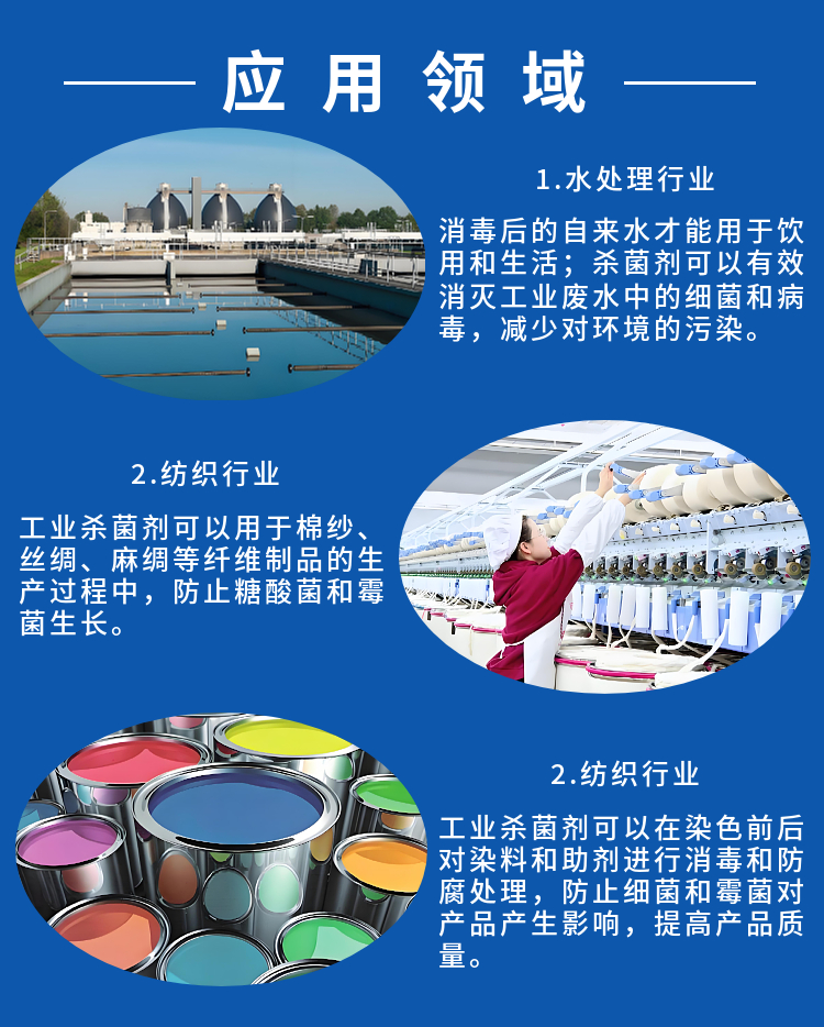 殺菌劑的應用領(lǐng)域非常廣泛,涉及多個(gè)行業(yè)。以下是殺菌劑在工業(yè)中常用的應用領(lǐng)域。